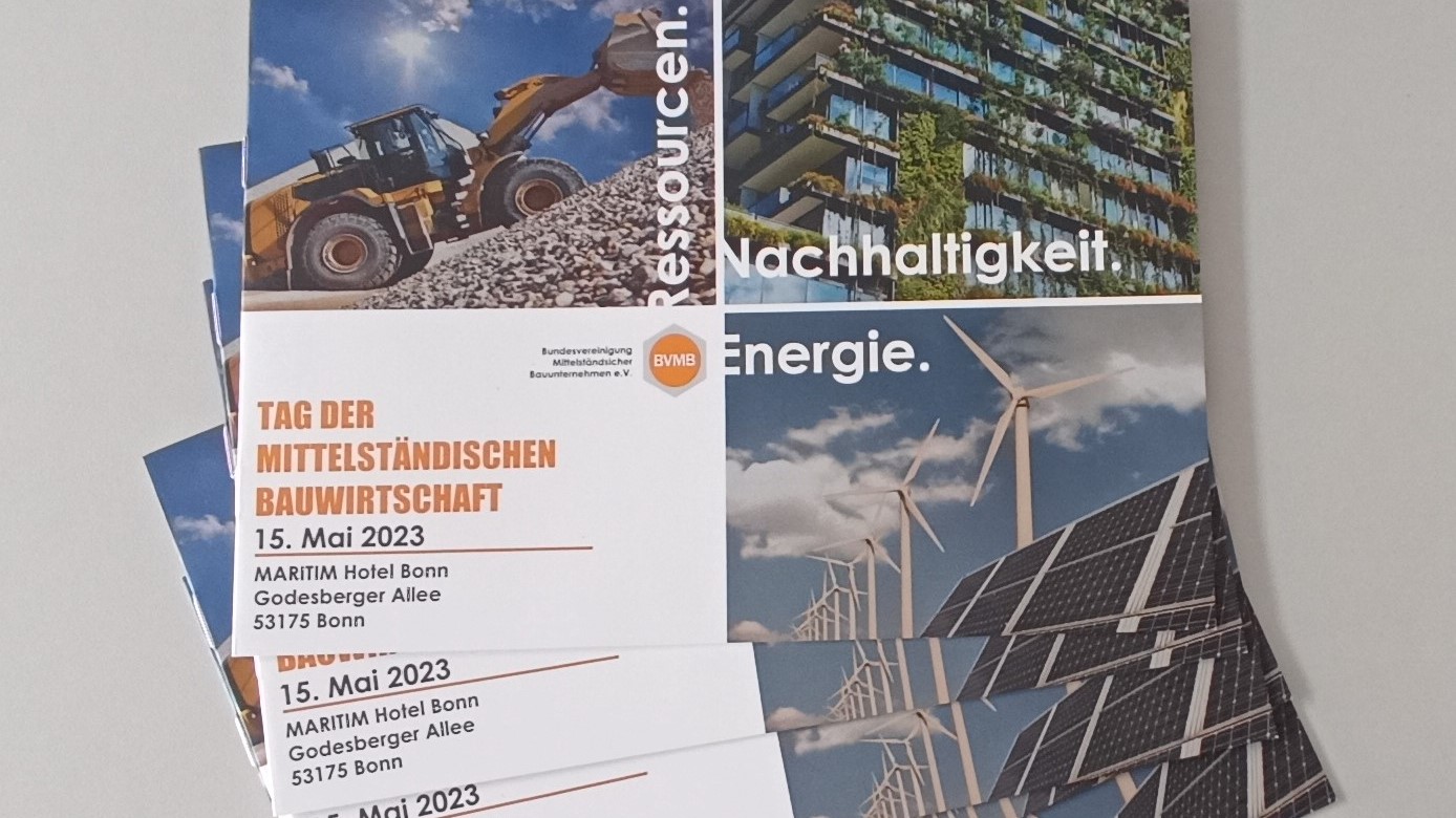 Wir freuen uns, am 15. Mai 2023 bei dem diesjährigen "Tag der mittelständischen Bauwirtschaft" mit dem Schwerpunkthema: "Ressourcen, Energie und Nachhaltigkeit - Rahmenbedingungen für Deutschland und ins besonders für die Bauwirtschaft dabei sein zu dürfen.